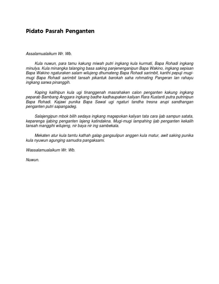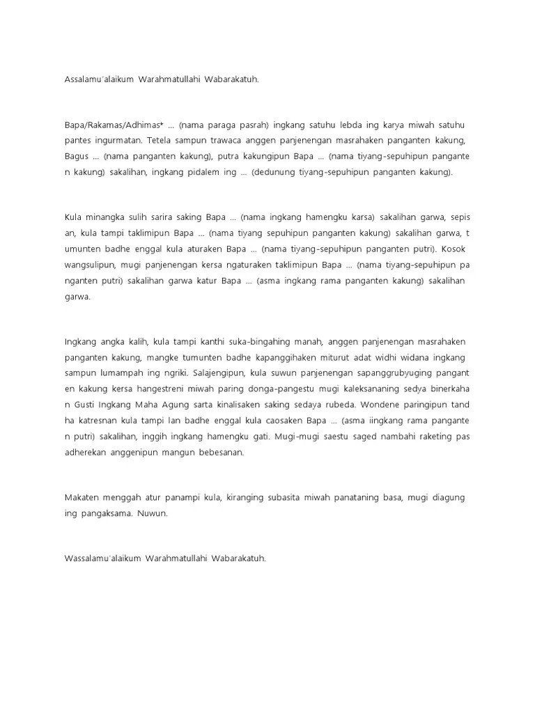 Pidato pasrah temanten assalamu alaikum wr.wb. Panjenengartipun bp ______ (ingkang pasrah) menggah lekasing pangandika panjenengan hamasrahaken putra temanten kakung kula tampi kanthi sae, . Panampi pasrah lamaran calon penganten assalamu'alaikum wr. Atur pasrah boyong temanten kekalih. Atur panampi pasrah temanten kakung assalamu'alaikum wr.wb.